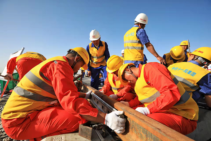 施工人员在将钢轨合龙。