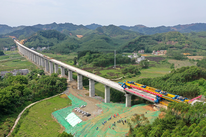 4月19日,位于广西壮族自治区马山县的贵南高铁位升双线特大桥最后一榀箱梁架设施工顺利完成,标志着贵南高铁广西段正线桥梁工程全面竣工。贵南高铁(贵州贵阳至广西南宁)是我国“八纵八横”高速铁路主通道包头至海口通道的重要组成部分,设计时速350公里。图为贵南高铁位升双线特大桥建设现场。