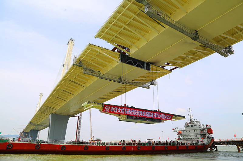 金海特大桥起自珠海横琴新区,跨越西江磨刀门水道,终至珠海机场东路,是珠机城际二期关键控制性工程。大桥全长1369米,宽49.6米,中间为时速160公里的双线城际铁路,两侧为时速100公里的双向六车道高速公路。