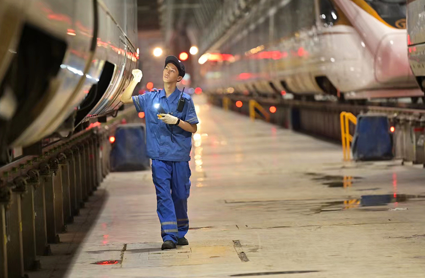 暑运期间,随着动车组上线率增加,动车组检修任务也变得繁重起来。天津动车客车段动车运用所检修库内,动车组机械师正在热火朝天地进行动车组检修作业。进入三伏天,夜晚的检修库更加闷热,动车组车顶温度最高达到45℃,动车组机械师们坚守在岗位上,高标准完成检修任务,保障暑运动车组安全平稳运行。