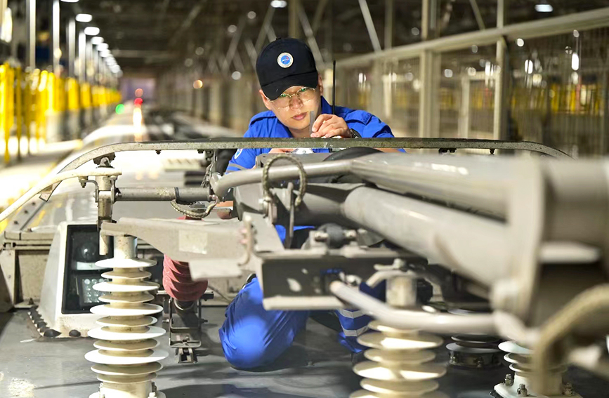 动车组机械师正在进行两侧作业,检查动车组转向架、风挡、裙板等部件状态。