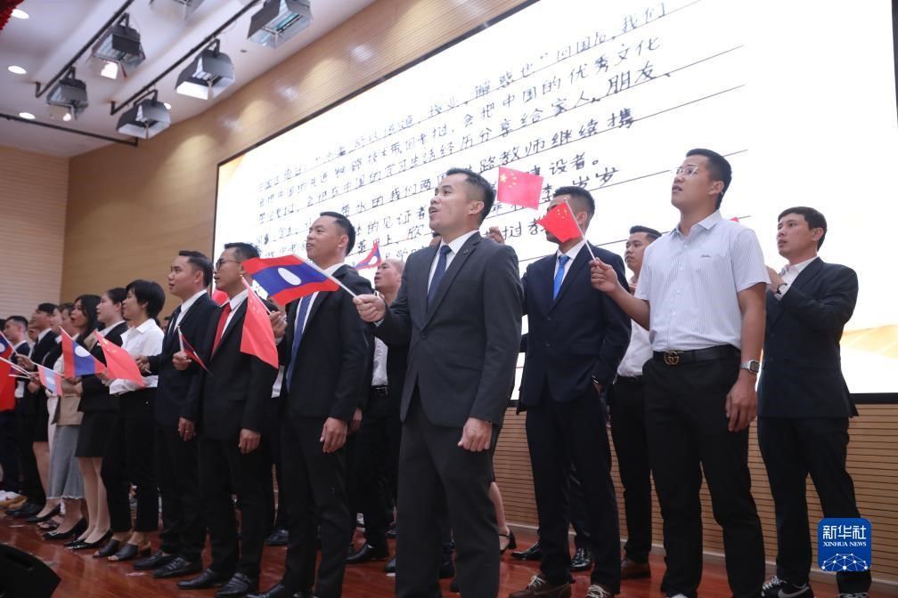 7月31日,在昆明铁道职业技术学院,完成专业知识学习的老挝首批40名铁路教师在结业典礼上庆祝。