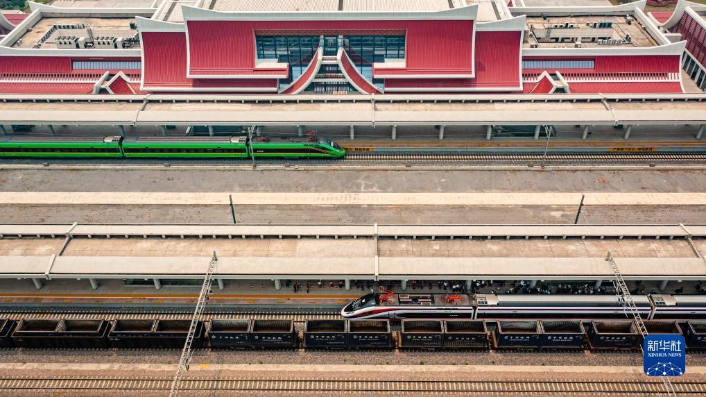 4月13日,“复兴号”(上)、“澜沧号”动车组列车停靠在中老铁路磨憨站。