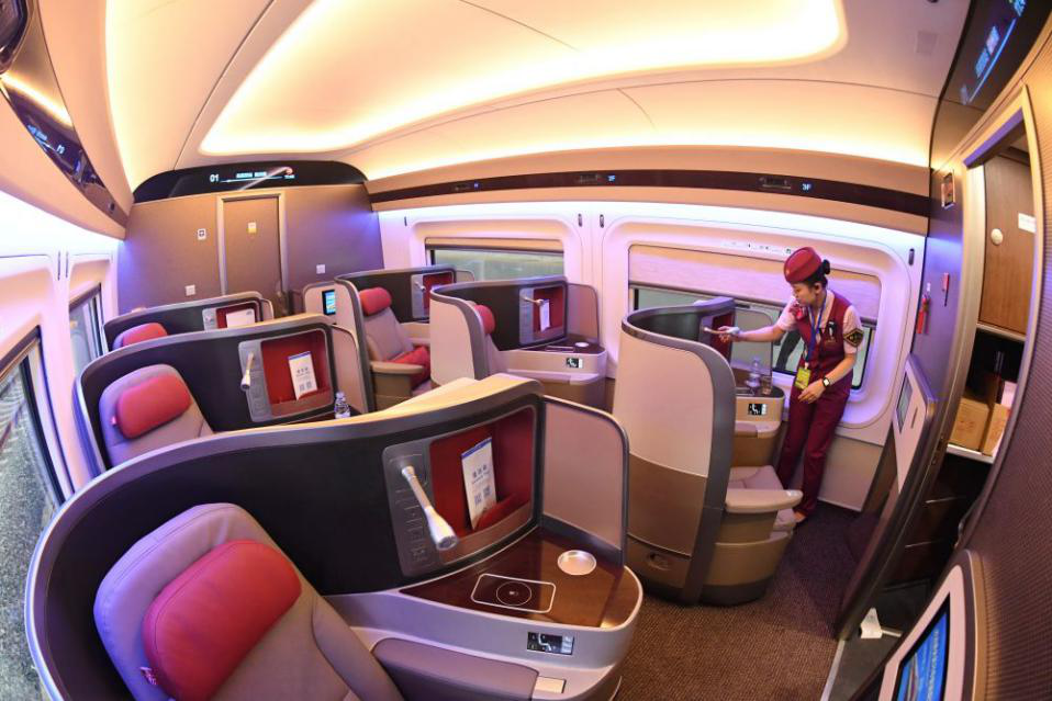 G55401次试运行动车组列车长余艳介绍,列车按照人机工程原理全面升级的座椅、电动腿靠等,大幅提升了座椅独立空间和乘坐舒适度,并增加了USB充电插口、无障碍车厢盲文标识,卫生间内设智能照明,进一步提升了列车的节能环保效能。此外,智能传感、智能监测、智能诊断等技术,为行车安全提供更好的保障,提升了动车组运维的智能化水平。