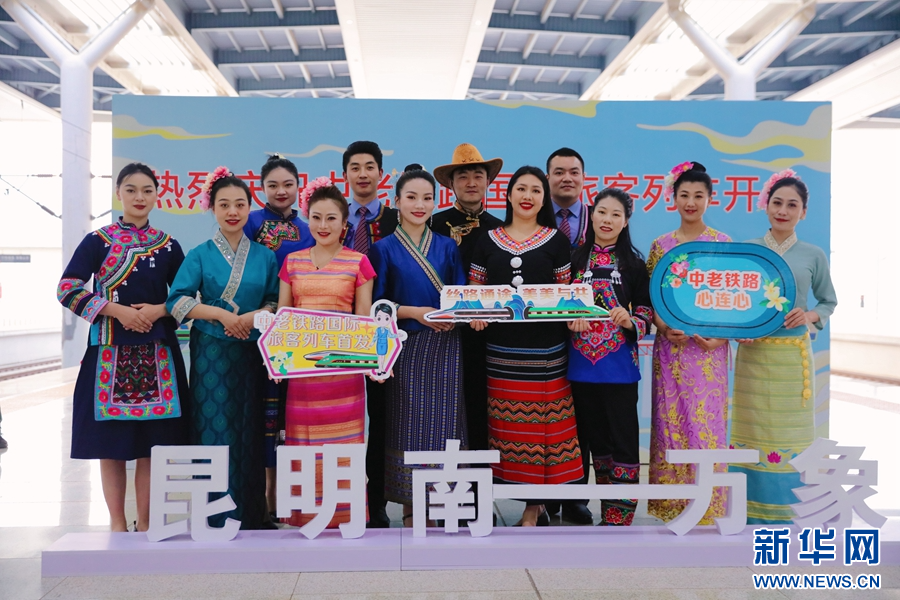4月13日,在昆明南站举行的中老铁路国际旅客列车首发仪式上,铁路职工盛装迎接旅客。