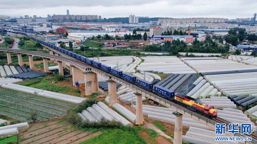 10月8日,“沪滇·澜湄线”国际货运班列从昆明市王家营西站驶出。