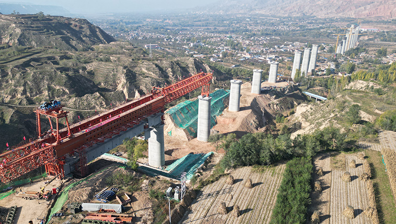 位于甘肃临夏境内的兰合铁路4标段泄湖峡大夏河特大桥胶拼梁架设施工现场。