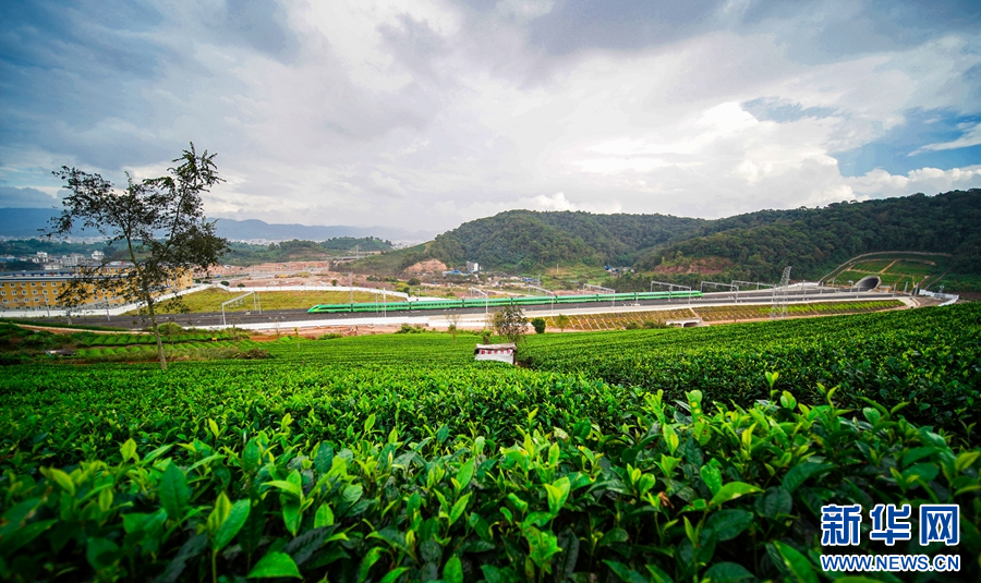 云南省普洱市思茅区,复兴号动车与一片茶园“同框”。