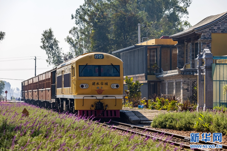 云南省红河州建水县,一列“建水古城号”米轨小火车穿行在线路上。