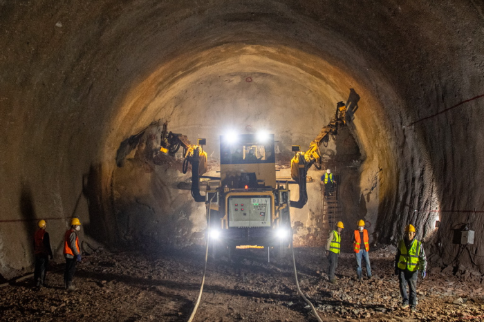 图为位于重庆市大足区的成渝中线高铁刘三寨隧道建设现场,工作人员在操作工程机械进行施工作业。