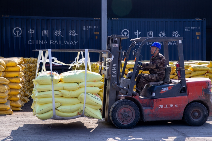 3月13日,在中国铁路哈尔滨局集团有限公司大庆车务段肇东站货场,工作人员用叉车运送化肥。