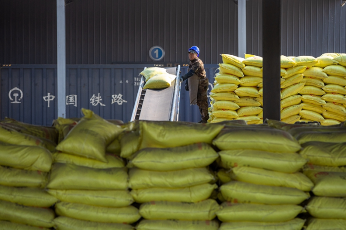 3月13日,在中国铁路哈尔滨局集团有限公司大庆车务段肇东站货场,工作人员在装卸化肥。