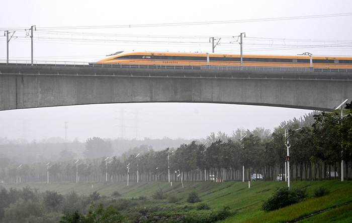 联调联试综合检测列车驶过位于陕西省西安市的西延高铁渭河特大桥。