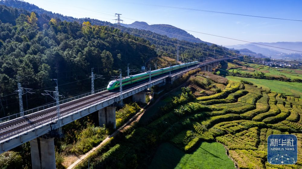 12月2日,一列中老铁路“复兴号”动车组穿过云南省普洱市宁洱哈尼族彝族自治县的麦田。