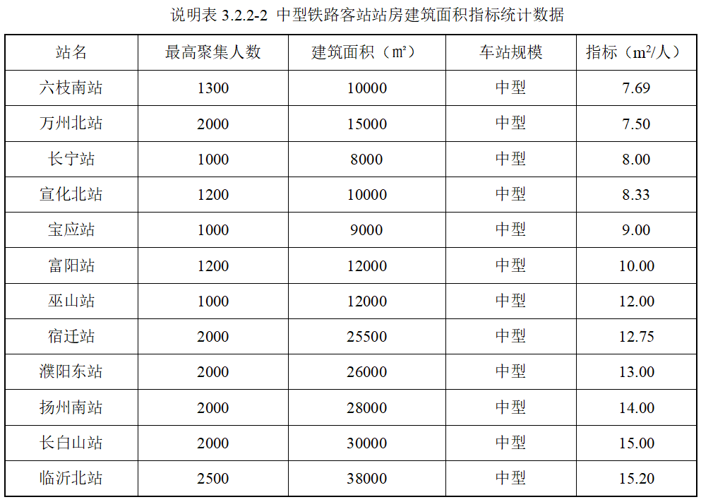 说明表3.2.2-1、3.2.2-2、3.2.2-3是近年运营效果较好的铁路客站站房的建筑面积指标统计数据。
