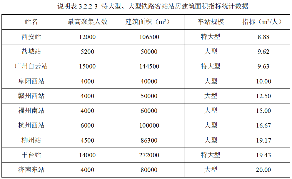 3 特大型、大型铁路客站站房建筑面积宜为 9 ㎡/人~20 ㎡/人。
