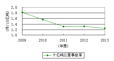 依据国家《安全生产“十二五”规划》对各行业(领域)安全生产规划指标,要求到2015年铁路交通十亿吨公里死亡率较2010年下降25%以上。2013年国家铁路未发生铁路交通特别重大、重大事故,地方铁路发生重大事故1件;全国铁路交通事故十亿吨公里事故率为1.253,比2012年下降5.2%;全年铁路交通事故死亡人数1336人,比2012年下降5.7%;10亿吨公里死亡率为0.336,比2012年下降7.7%。