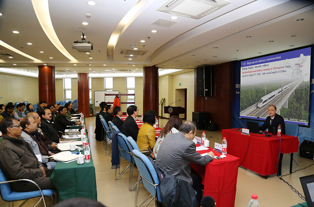 在华举办印度重载铁路高层管理人员研修班,是落实两国领导人关于加强双边合作的共识,务实推进铁路领域合作的重要行动。今年9月18日,在习近平主席访印期间,交通运输部副部长、国家铁路局局长陆东福与印度铁路委员会主席阿鲁南德拉.库玛尔在中印两国领导人的共同见证下,代表双方政府签署了中印铁路合作备忘录和行动计划。重载铁路运输培训作为中印铁路合作项目之一,经双方协商,计划举办5期研修班,由北京交通大学具体承办。印度驻华大使康特在开班致辞中表示,由衷敬佩中国铁路发展迅速,高速铁路处于世界领先地位,强调重载铁路培训是两国铁路合作的重要内容,开局良好,相信两国铁路合作会更深入、更广泛、更紧密。