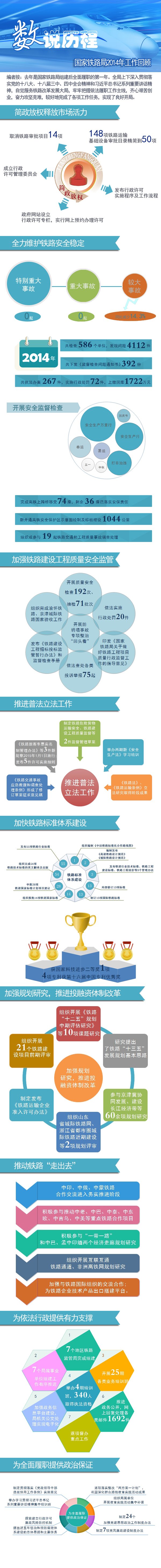 二是强化监管执法,全力维护铁路安全稳定。先后组织开展了春运、“两会”、暑期汛期、国庆节和四中全会期间安全督查等9项监督检查及铁路行业“安全生产月”和“安全生产万里行”活动,全年共检查586个单位,发现问题4112件,下发《监督检查问题通知书》392份,解决了一批影响铁路安全的隐患。扎实开展铁路行业“打非治违”专项行动,集中打击整治铁路安全保护范围内违法行为等6方面重点问题,对关系高铁运输安全的上跨立交桥移交问题和新开通高铁沿线安全保护区划定事项实行挂牌督办,全路110座未移交的高铁上跨桥已完成移交74座,剩余36座落实了管理单位和安全保障责任;新开通高铁安全保护区示意图绘制及标桩埋设1044公里。全局共执法办案267件,实施行政处罚72件,上缴国库1722万元。建立完善突发事件应急响应与事故调查机制,全年组织或参与19起铁路交通事故和工程质量事故的调查处理,初步形成了与各级检察、公安机关及安监部门协调配合的事故调查机制。国家铁路局机关及7个地区监管局成立了安委会,铁路运输、工程施工、设备造修等相关企业负责人为安委会的联络员,定期分析铁路安全形势;国家铁路局与相关部委、地区监管局与相关地方人民政府在开展安全监督检查、“打非治违”、事故应急救援及调查处理等方面,积极有效地加强信息沟通、工作协调和联合执法。2014年,全国铁路没有发生特别重大、重大事故,较大事故同比减少14.3%。