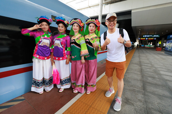 8月8日,身着少数民族特色服装的工作人员在D6155次列车旁迎接旅客。新华社记者 刘续 摄
