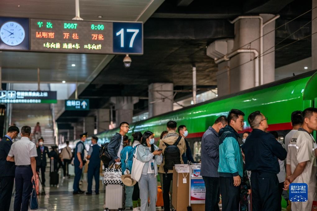 旅客在昆明南站准备登乘去往万象的国际联运列车。