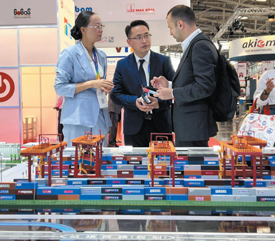 在2023年慕尼黑国际物流博览会上,工作人员在中铁集装箱运输有限公司展台前向国外客户介绍广州国际港中欧班列站点设施。