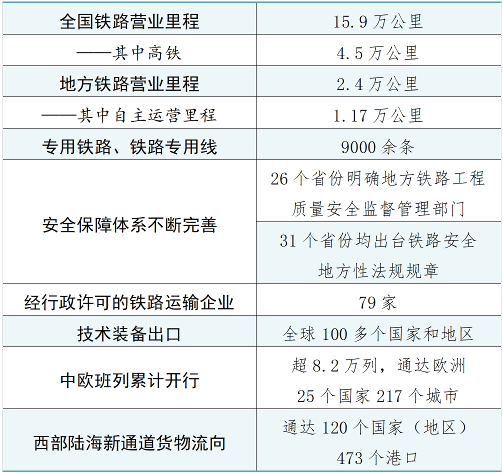 六是“走出去”开创新局面。亚吉铁路、蒙内铁路、匈塞铁路贝诺段、中老铁路、雅万高铁等一批项目投产运营。技术装备出口全球100多个国家和地区。中欧班列累计开行超8.2万列、790万标箱,通达欧洲25个国家217个城市。西部陆海新通道货物流向通达120个国家(地区)473个港口。