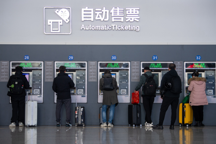 旅客在杭州东站自动售票处办理业务。