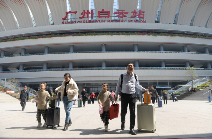 刚下火车的旅客从广州白云站走出。