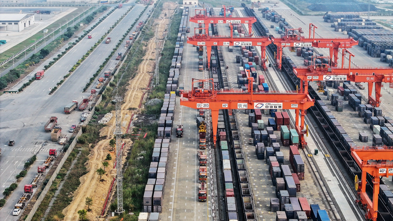 目前,不少石料运输已实现“公转铁”,经铁路运输至钦州港东站,随后换乘海运抵达我国东部沿海港口城市。铁路部门陆续研发了适应轻泡货物运输的大容积内陆箱、适应卷钢运输的卷钢箱、适应粮食运输的顶开门箱等15种新集装箱箱型,其中9种箱型已成功应用。