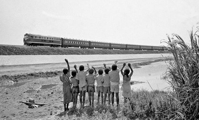 赞比亚鲁西瓦西湖畔的少年儿童欢迎坦赞铁路的列车通到他们的家乡(1976年摄)。