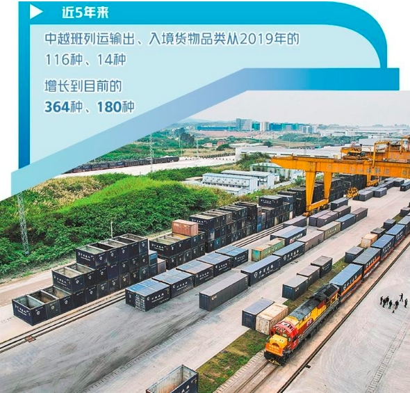 数据表明,高效、实惠、便捷的中越班列已得到市场认可。近5年来,中越班列运输出、入境货物品类从2019年的116种、14种,增长到目前的364种、180种。中越班列集货地已覆盖广西及周边省份20多个地市,跨境货物运输覆盖越南、老挝、泰国等多个东盟国家。