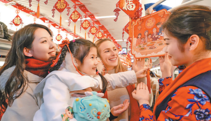 在北京西站开往郑州东站的G97次列车上,中国铁路郑州局集团公司工作人员组织各式“迎新春”特色活动,让乘客在旅途中感受春节的美好氛围。