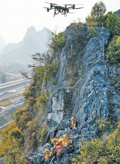 黔桂铁路一处沿线山体上,中国铁路南宁局集团公司柳州工务段桥隧工用无人机运输的材料整治危石。