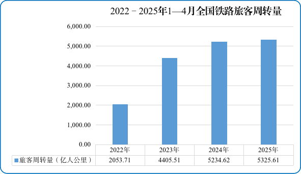 图2 2022—2025年1—4月全国铁路旅客周转量