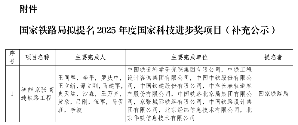 国家铁路局关于2025年度国家科学技术奖拟提名项目的补充公示