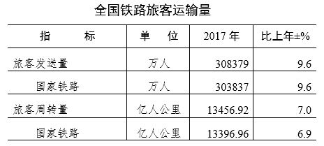 旅客运输。全国铁路旅客发送量完成30.84亿人,比上年增加2.70亿人,增长9.6%,其中,国家铁路30.38亿人,比上年增长9.6%。全国铁路旅客周转量完成13456.92亿人公里,比上年增加877.63亿人公里,增长7.0%,其中,国家铁路13396.96亿人公里,比上年增长6.9%。