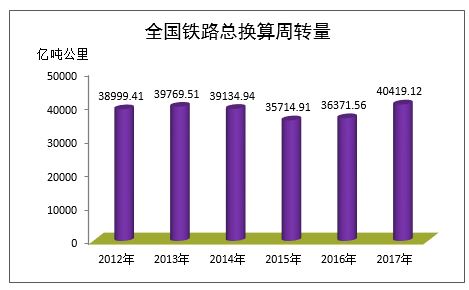 换算周转量。全国铁路总换算周转量完成40419.12亿吨公里,比上年增加4047.57亿吨公里,增长11.1%,其中,国家铁路37488.66亿吨公里,比上年增长10.9%。