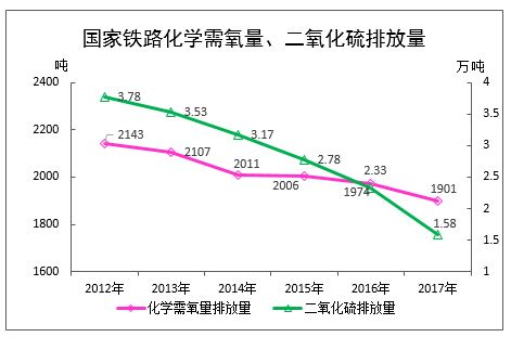 主要污染物排放量。国家铁路化学需氧量排放量1901吨,比上年减排73吨,降低3.7%。二氧化硫排放量15817吨,比上年减排7511吨,降低32.2%。