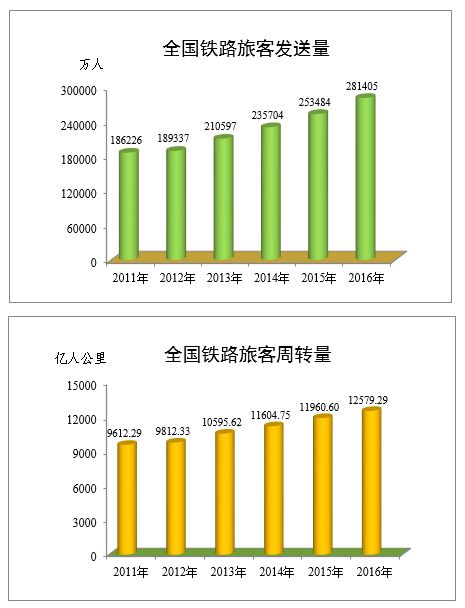 旅客运输。全国铁路旅客发送量完成28.14亿人,比上年增加2.79亿人,增长11.0%,其中,国家铁路27.73亿人,比上年增长11.1%;全国铁路旅客周转量完成12579.29亿人公里,比上年增加618.69亿人公里,增长5.2%,其中,国家铁路12527.88亿人公里,比上年增长5.2%。
