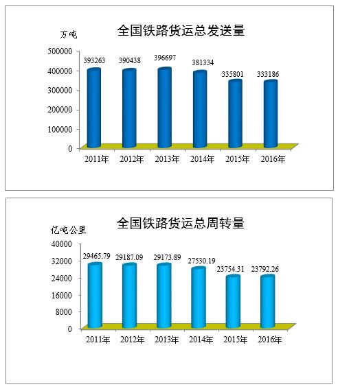 货物运输。全国铁路货运总发送量完成33.32亿吨,比上年减少0.26亿吨,下降0.8%。其中,国家铁路26.52亿吨,比上年下降2.3%。全国铁路货运总周转量完成23792.26亿吨公里,比上年增加37.95亿吨公里,增长0.2%。其中,国家铁路21273.21亿吨公里,比上年下降1.5%。集装箱、商品汽车、散货快运量比上年分别增长40%、53%和25%。