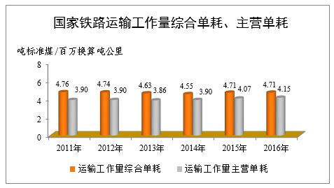 综合能耗。国家铁路能源消耗折算标准煤1591.60万吨,比上年增加14.25万吨,增长0.9%。单位运输工作量综合能耗4.71吨标准煤/百万换算吨公里,与上年持平。单位运输工作量主营综合能耗4.15吨标准煤/百万换算吨公里,比上年增加0.08吨标准煤/百万换算吨公里,增长2.0%。