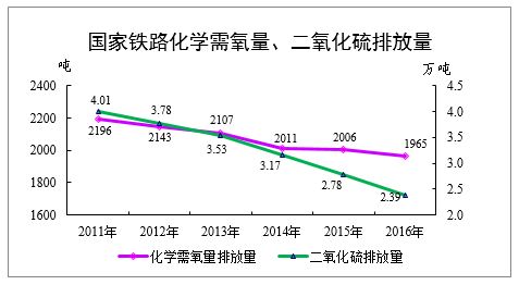 主要污染物排放量。国家铁路化学需氧量排放量1965吨,比上年减排41吨,降低2.0%。二氧化硫排放量23924吨,比上年减排3851吨,降低13.9%。