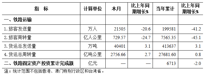 2020年11月份全国铁路主要指标完成情况