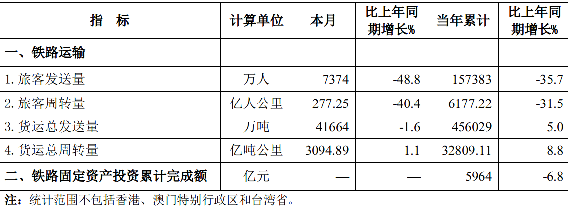 2022年11月份全国铁路主要指标完成情况