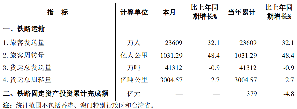 2023年1月份全国铁路主要指标完成情况