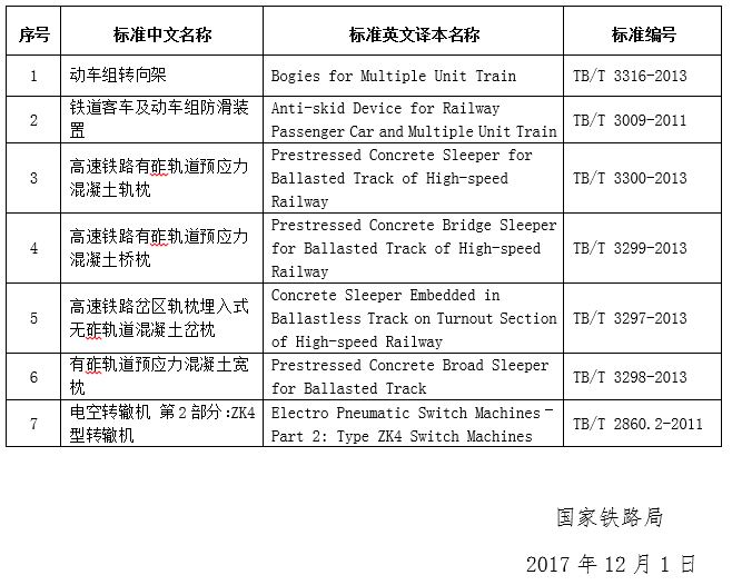 为推动中外铁路技术交流,国家铁路局组织了《动车组转向架》(TB/T 3316-2013)等7项铁道行业技术标准英文翻译工作。英文译本与中文版铁路技术标准在技术上出现异议时,以中文版为准。