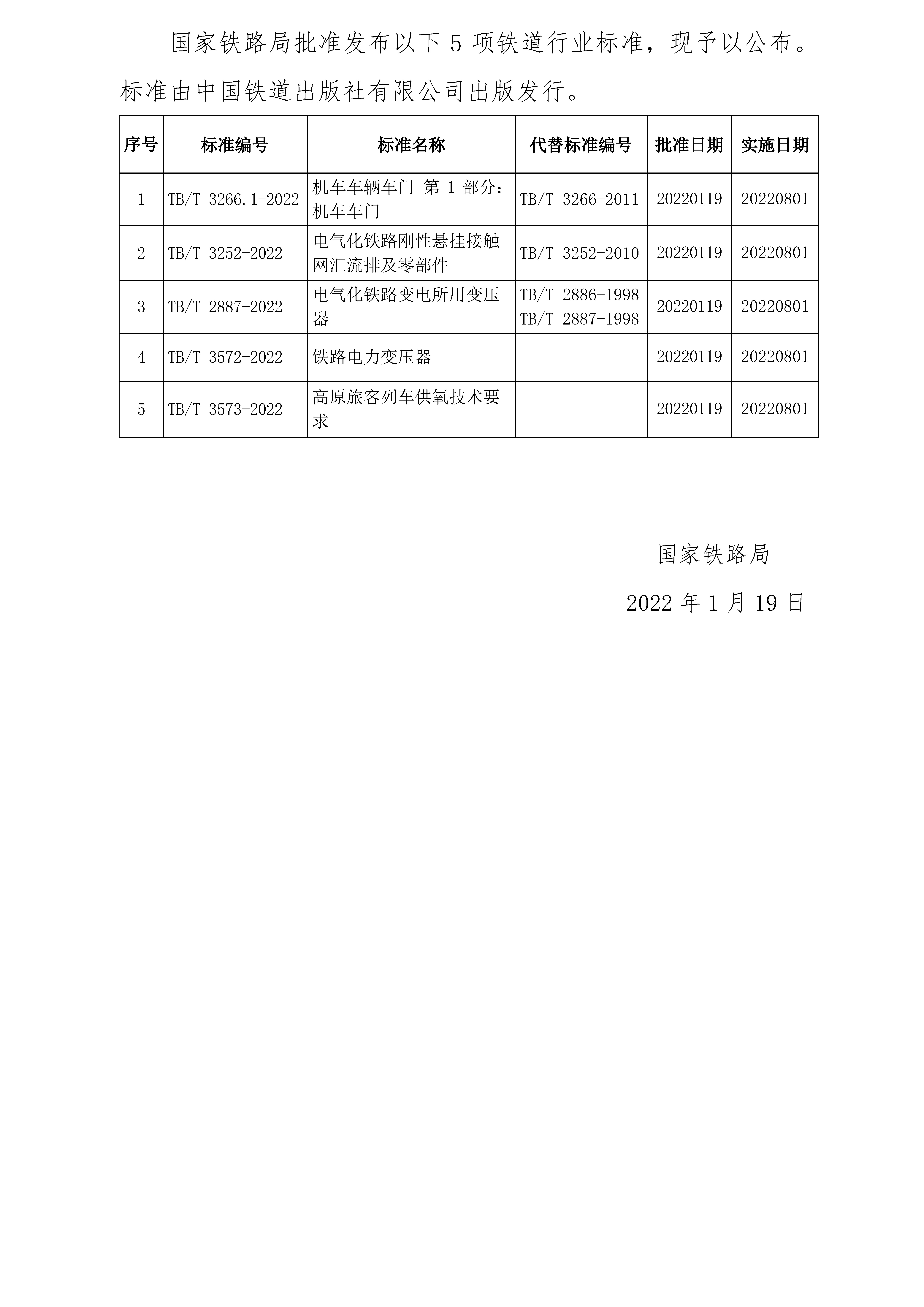 国家铁路局发布《机车车辆车门 第1部分:机车车门》等5项铁道行业标准。