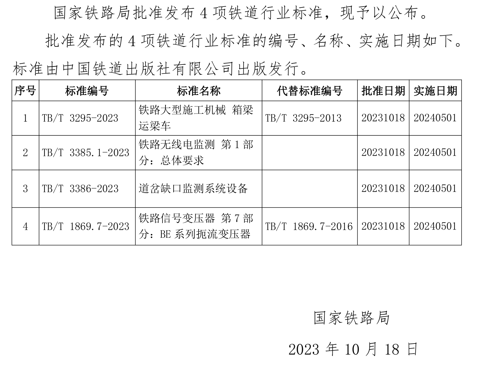 国家铁路局发布《铁路大型施工机械 箱梁运梁车》等4项铁道行业技术标准。