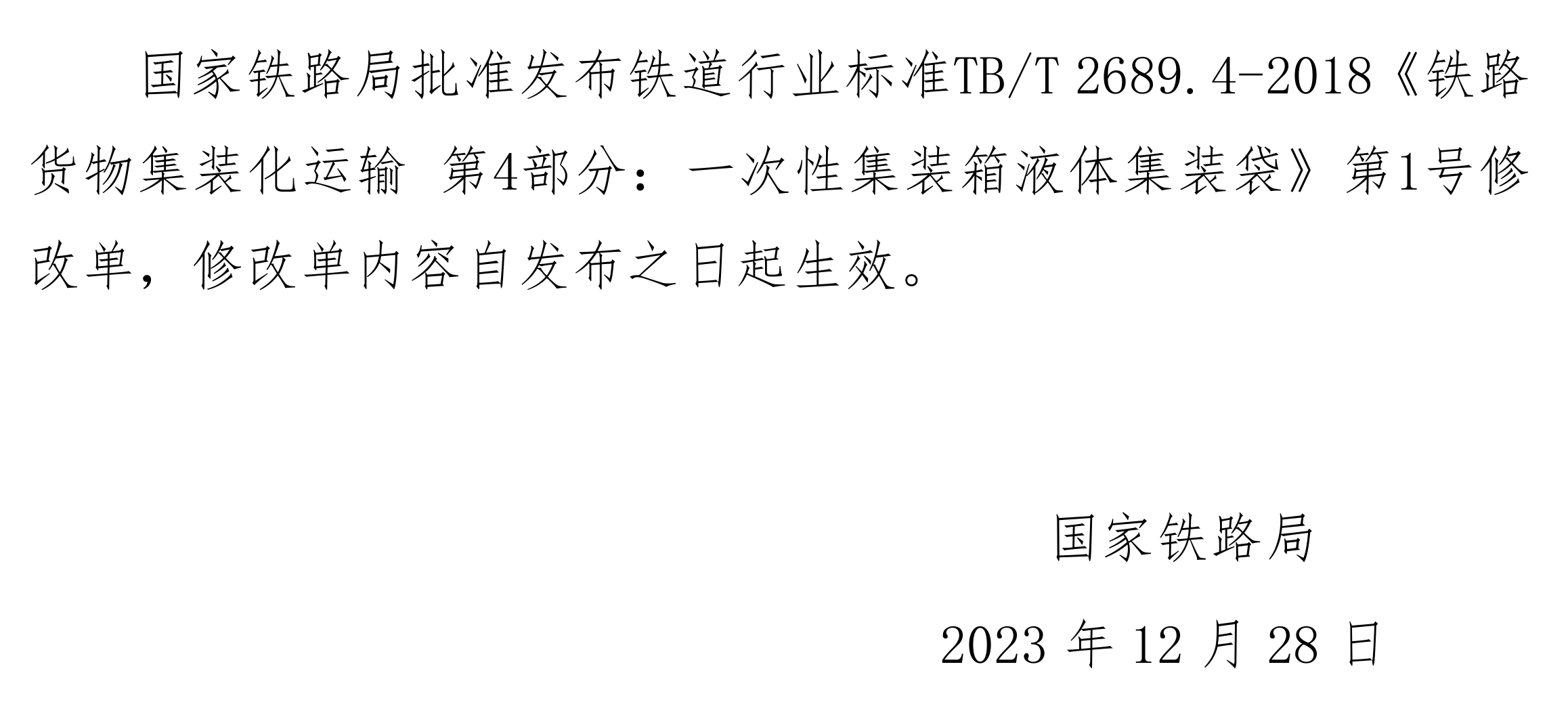 国家铁路局发布铁道行业标准《铁路货物集装化运输 第4部分:一次性集装箱液体集装袋》修改单。